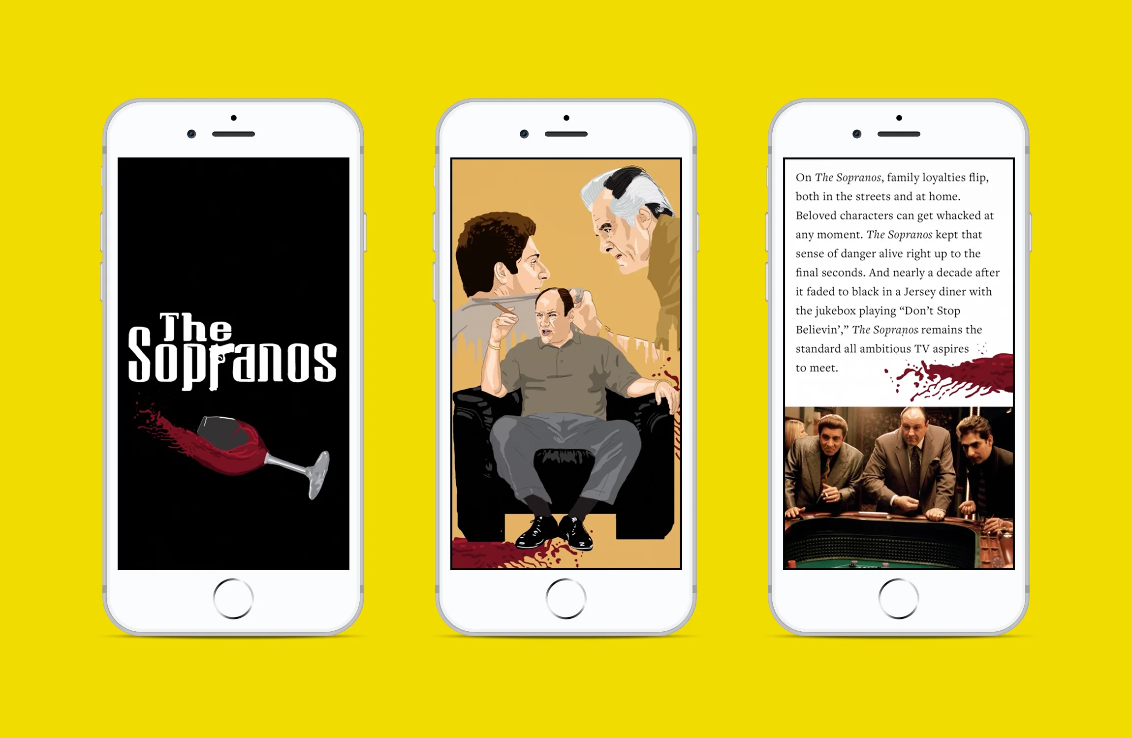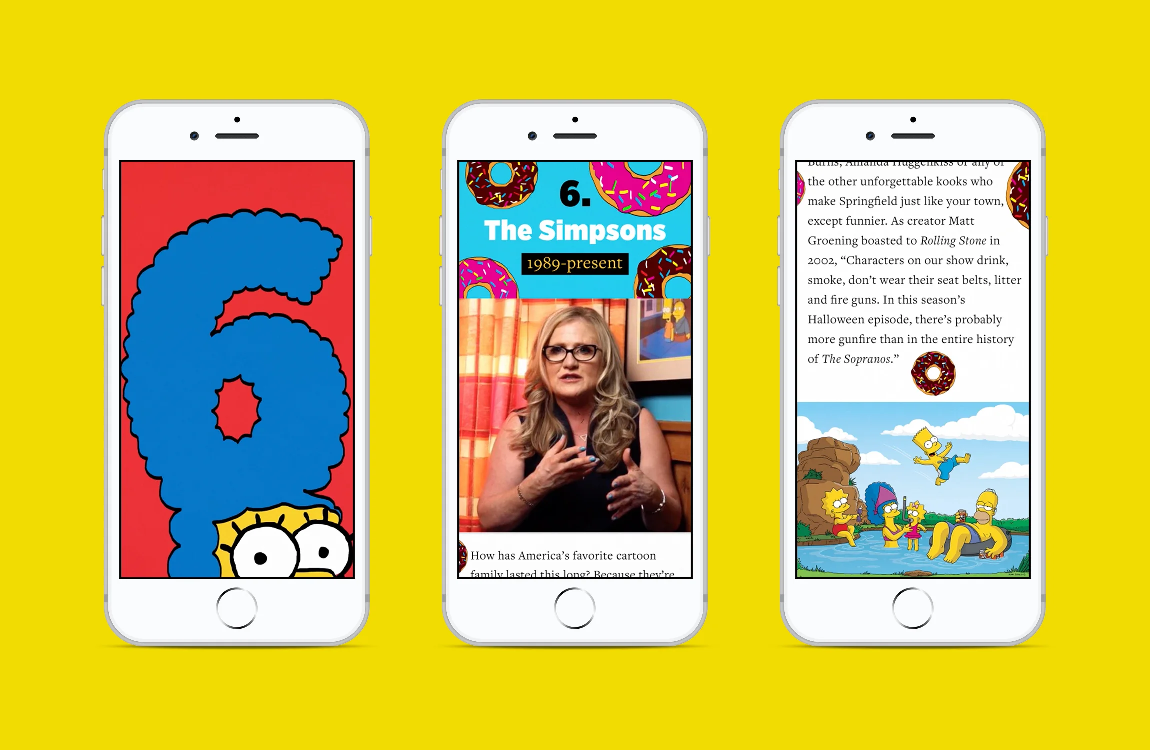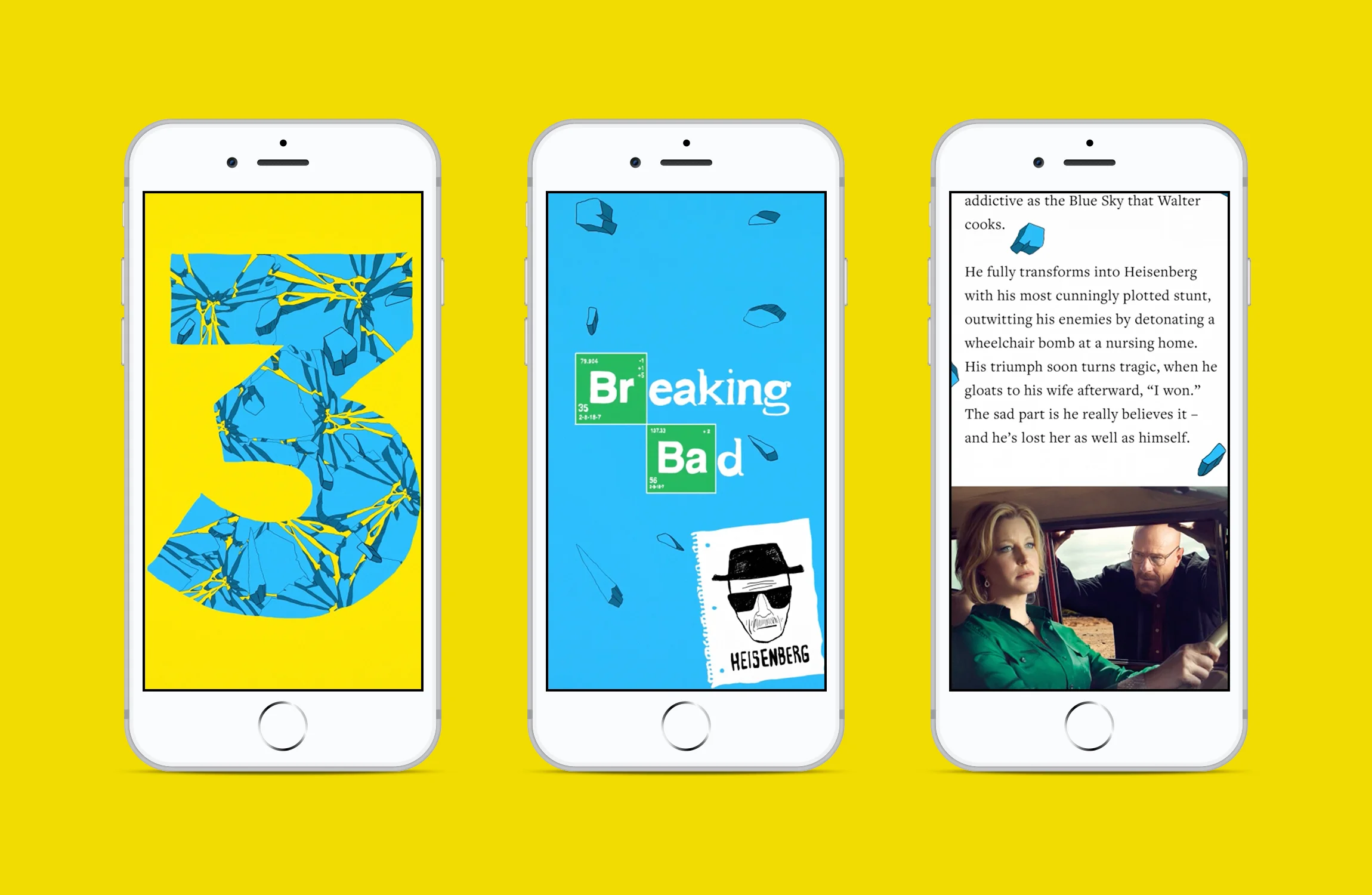 We worked with Snapchat to launch the 20 Greatest TV Shows of All Time presented by Rolling Stone on the Snapchat Discover platform. Our goal for the overall product itself was to take advantage of Snapchat's ux within Discover and turn the experience into a super enticing countdown (20 to 1), this had not been done before at the time. Users would be greeted on each snap with an animated 10 second preview of the individual show, they then would have the option to dive deeper into the content by scrolling down and exploring the article and interviews. Then rinse and repeat until the user discovered the #1 show.